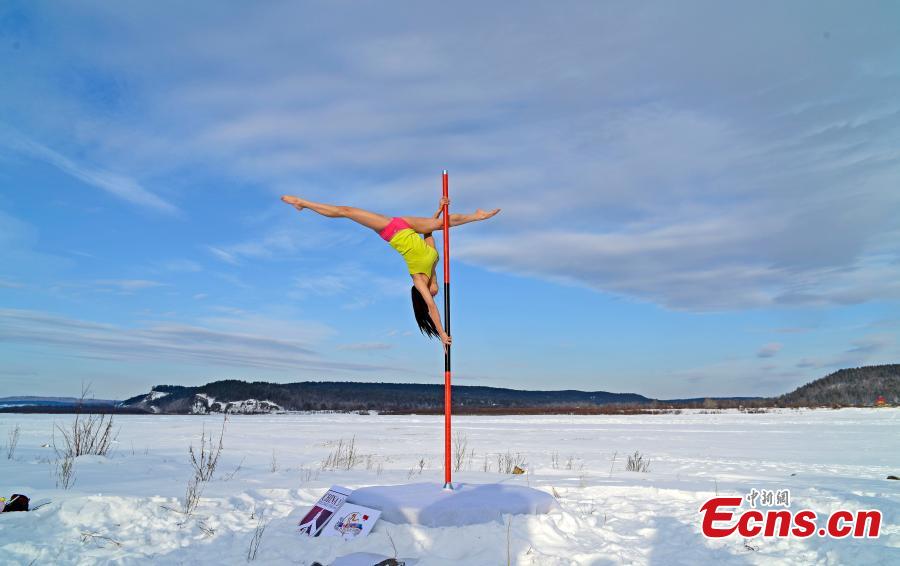 A member of China's National Pole Dance Team performs while temperature dips to minus 50 degrees Centigrade in Beiji village, Northeast China’s Heilongjiang province, Dec 24, 2014. The village, located in the nation's most northerly point bordering with Russia, is known as China's North Pole. [Photo: China News Service/Zhong Xin]