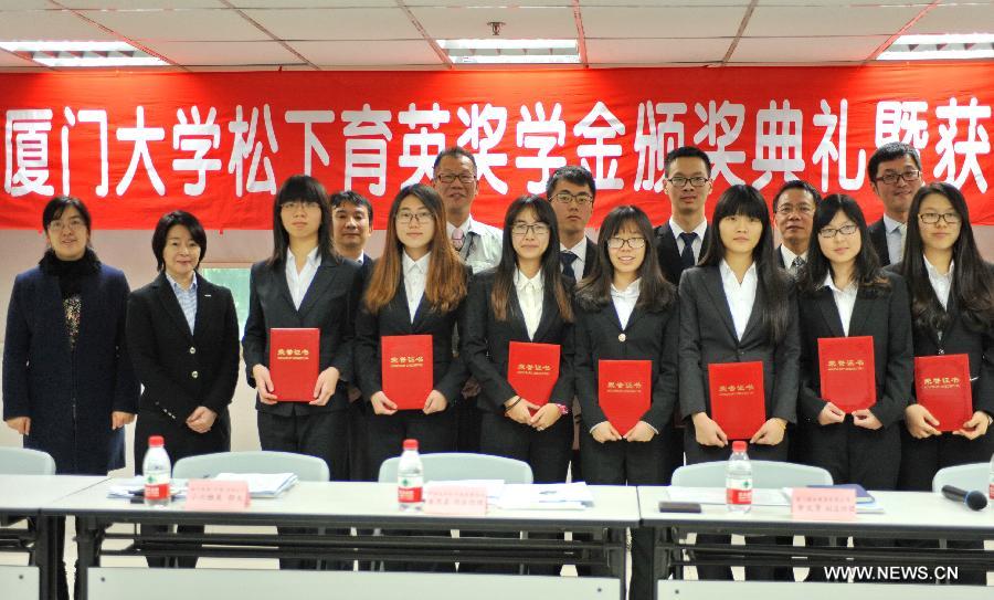 Students show their credentials of scholarship at Xiamen University in Xiamen, southeast China's Fujian Province, Dec. 25, 2014. Ten students of the university were rewarded scholarships provided by Panasonic on Thursday. (Xinhua/Lin Shanchuan)