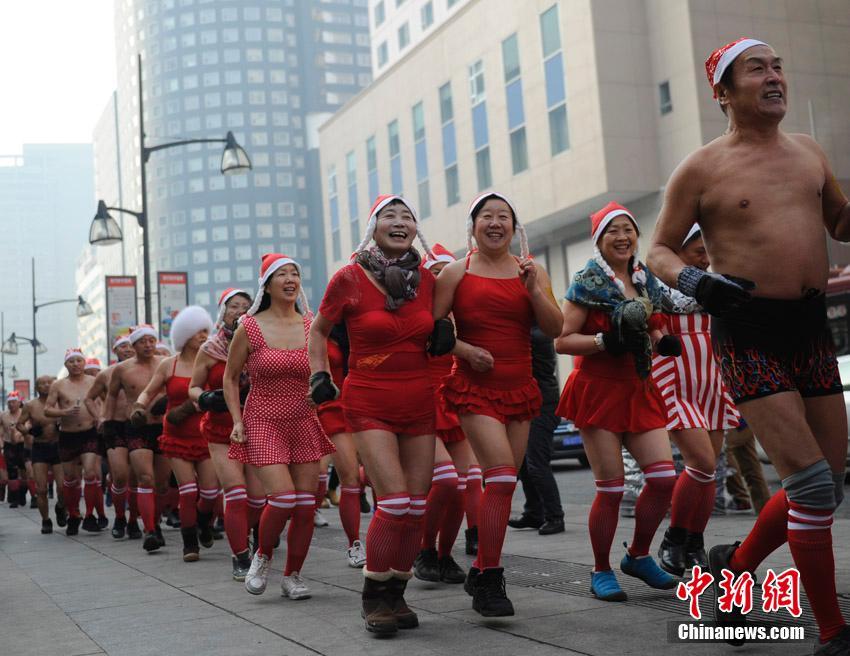 Citizens, braving the cold, participate in a swimsuit run in Changchun, northeast China's Jilin province on Dec. 24, 2014, to celebrate Christmas. (CNS/Zhang Yao)