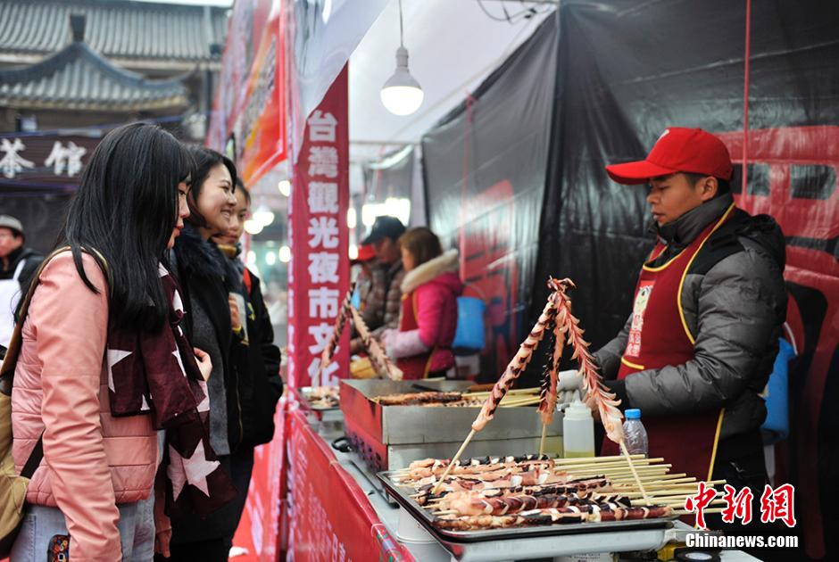 Three famous night markets in Taiwan - Shilin, Fengjia, and Liuhe - come to Chengdu Dec. 24, 2014. In addition to delicious food, the Electric Techno Neon Gods, a subcultural performance which combines traditional Taiwan folk performance with modern pop music, and face-changing of Sichuan Opera can also be found at the food carnival. (Chinanews/An Yuan)