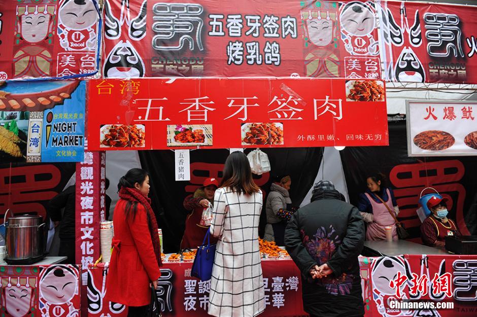 Three famous night markets in Taiwan - Shilin, Fengjia, and Liuhe - come to Chengdu Dec. 24, 2014. In addition to delicious food, the Electric Techno Neon Gods, a subcultural performance which combines traditional Taiwan folk performance with modern pop music, and face-changing of Sichuan Opera can also be found at the food carnival. (Chinanews/An Yuan)