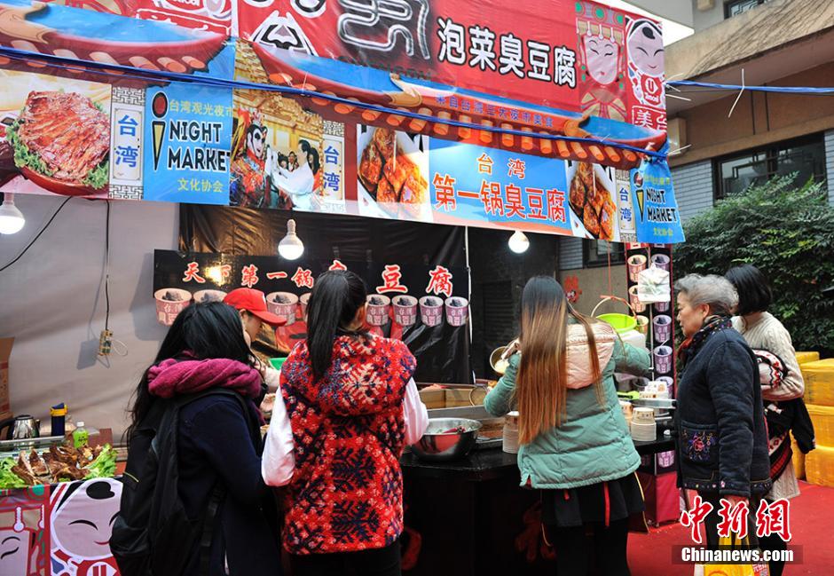 Three famous night markets in Taiwan - Shilin, Fengjia, and Liuhe - come to Chengdu Dec. 24, 2014. In addition to delicious food, the Electric Techno Neon Gods, a subcultural performance which combines traditional Taiwan folk performance with modern pop music, and face-changing of Sichuan Opera can also be found at the food carnival. (Chinanews/An Yuan)