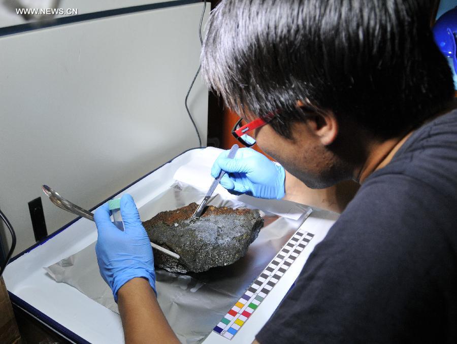 A member of a Chinese scientific research team studies a sulfide sample collected by Jiaolong, China's first manned deep-sea submersible, in the southwest Indian Ocean, Dec. 26, 2014. (Xinhua/Zhang Xudong)