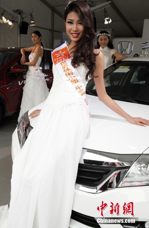 Seventy contestants of Miss Leisure 2014 take part in public service activities and pose for pictures in south China's Guangdong province on Dec.18, 2014, during visits to an auto show and a tour along the Pearl River. (China News Service/Qian Xingqiang)
