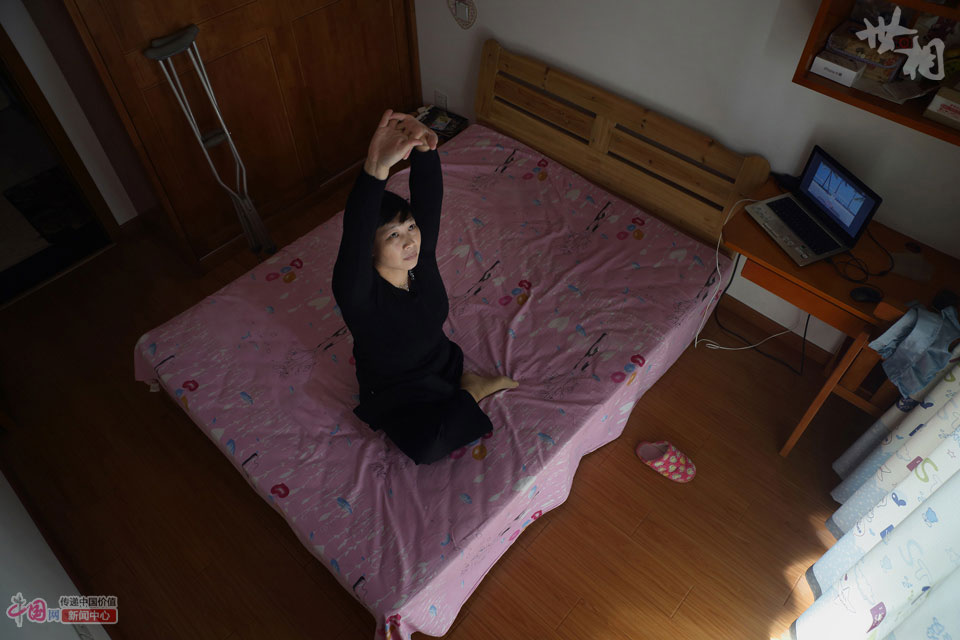 Xiong Yan practices yoga by watching instructional videos.(Photo/China.org.cn)