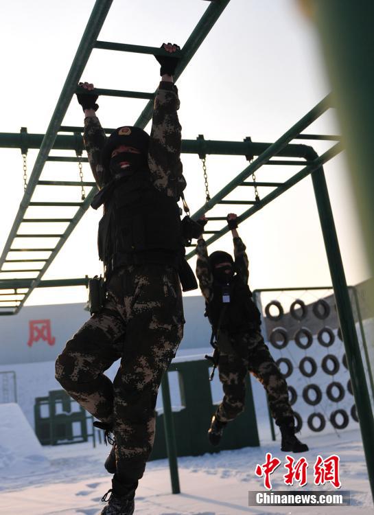 Female SWAT team members in Xinjiang train under harsh weather condition, Dec. 25, 2014. Members of this team are all with excellent physical qualities and educational backgrounds. After a long-term systematic training, they will undertake the mission of protecting the people and maintaining safety of the society. (Chinanews/Fan Xinyu)