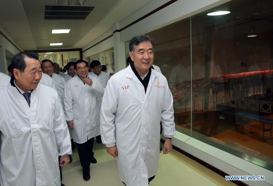 Chinese Vice Premier Wang Yang (front, R) visits an egg company in Beijing, capital of China, Dec. 29, 2014. Wang Yang made an inspection tour of modern agriculture in Beijing on Monday. (Xinhua/Liu Weibing)