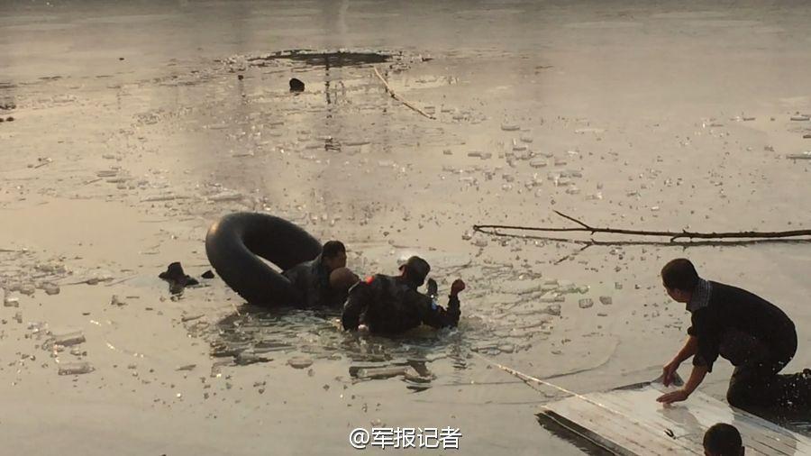 On Dec. 27, two men accidentally fell into an ice hole on a lake in Laiyang, east China’s Shandong province. Zhang Yulei and Liu Haiwen, two PLA soldiers who were on duty nearby, rapidly came to the accidental site to rescue the two drowning men with electric wires and other things available. Later, more soldiers took part in the rescue. Unfortunately, one of the men died, and the other is all right. Zhang Yulei was frostbitten and hospitalized. (Photo source: official microblog of PLA Daily)