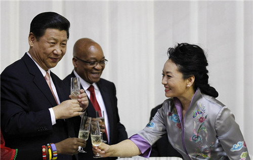 Chinese President Xi Jinping and his wife Peng Liyuan in traditional Chinese dress attend the welcome lunch held by South African President Jacob Zuma and his wife on Mar. 26, 2013.(Photo/Xinhua)