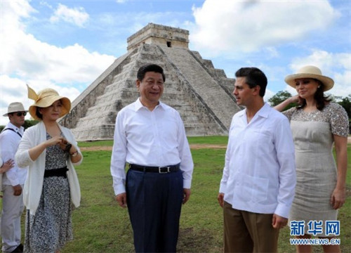 Accompanied by Mexican president and his wife, Chinese President Xi Jinping and his wife Peng Liyuan visit the ruins of Chichen Itza, a large pre-Columbian city built by the Maya people of the Terminal Classic on June 6, 2013.(Photo/Xinhua)