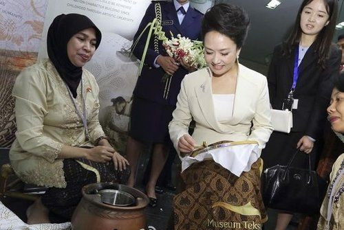 Under the guidance of an Indonesian artist, Peng Liyuan makes batik on Oct. 2, 2013.(Photo/Xinhua)