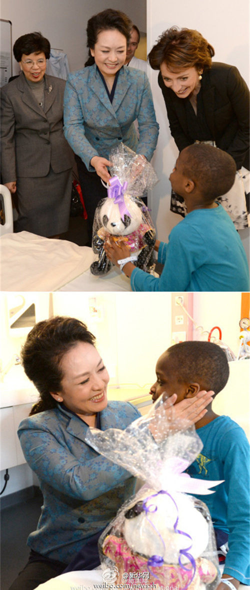 Peng Liyuan chats to a child with diseases and gives him a stuffed panda as a gift in a children's hospital in France on Mar. 26, 2014.(Photo/Xinhua)
