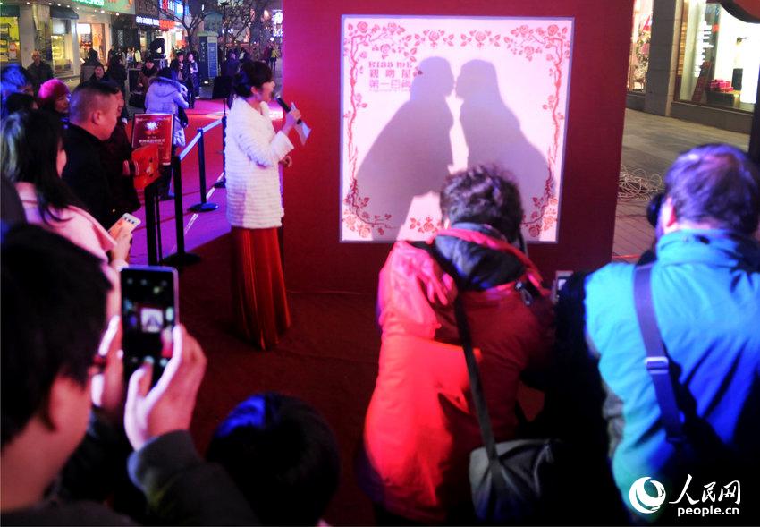A "kissing room" opens to public for the first time in front of the No.1 Shopping Mall in Jinhua, Zhejiang province on Dec. 20, 2014. Lovers may kiss each other following the music in the room, with people enjoying their sketch outside at the same time. The activity aroused love in peoples’ heart.(Photo source: CFP)