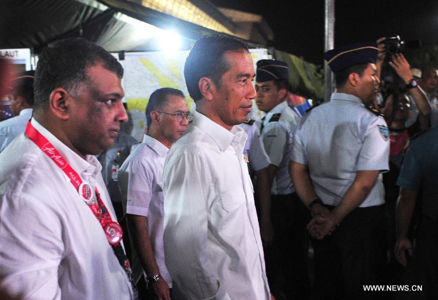 | Indonesian President Joko Widodo (front R) and Tony Fernandes, group chief executive officer of AirAsia (front L), walk after meeting family members of people on AirAsia flight QZ8501 at Juanda International Airport in Surabaya, Indonesia, on Dec. 30, 2014. AirAsia Indonesia said here Tuesday it will invite family members of passengers of its Flight QZ8501 to the Indonesian city of Surabaya, where the bodies of the perished people will be identified. (Xinhua/Zulkarnain) |