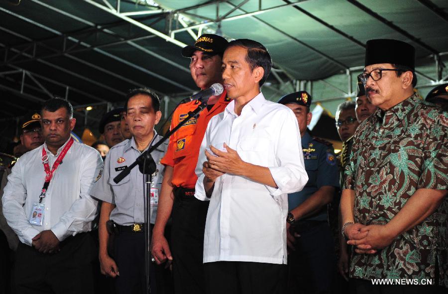 Indonesian President Joko Widodo (front) speaks to media after meeting family members of people on AirAsia flight QZ8501 at Juanda International Airport in Surabaya, Indonesia, on Dec. 30, 2014. AirAsia Indonesia said here Tuesday it will invite family members of passengers of its Flight QZ8501 to the Indonesian city of Surabaya, where the bodies of the perished people will be identified. (Xinhua/Zulkarnain)