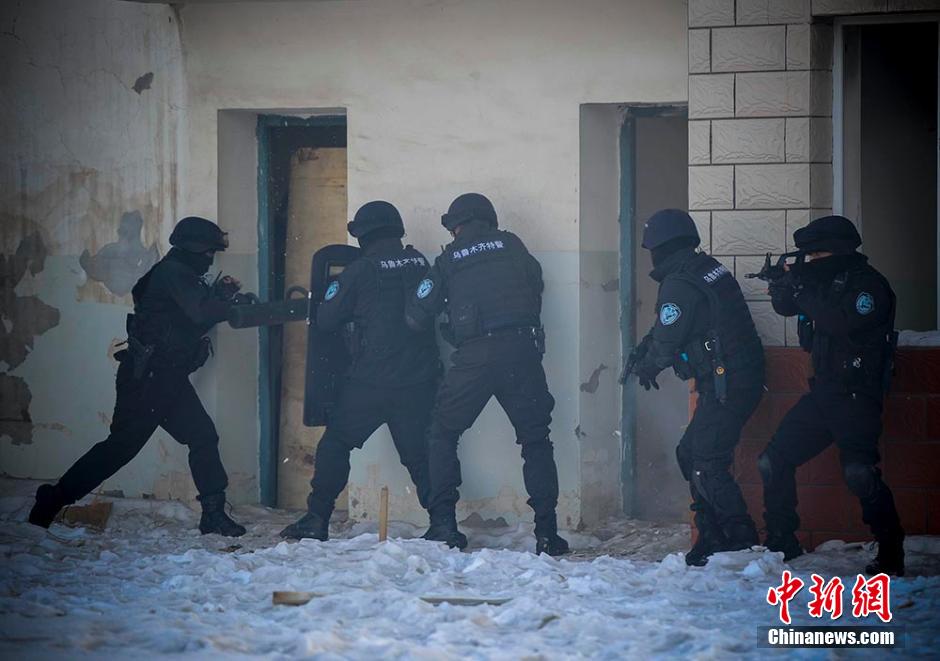 A SWAT team holds an anti-hijacking drill in Urumqi, northwest China’s Xinjiang Uygur Autonomous Region on Dec. 29, 2014. “Gangsters” hijacked several “hostages” with guns and knives and hid in a deserted factory. The SWAT members blitzed on “hijackers” and rescued the “hostages” rapidly. (Chinanews/Fang Tao)