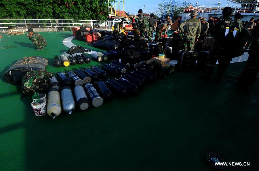 Searching team from Indonesian Navy prepare diving equipments for their searching operation in Pangkalan Bun, Central Kalimantan, Indonesia, Jan. 1, 2015. The search for 162 people who vanished Sunday aboard the AirAsia Flight QZ8501 was severely limited Wednesday by heavy rain, wind and thick clouds over the Java Sea, forecast to last through Friday. Choppy conditions prevented divers from entering the water and helicopters were largely grounded. (Xinhua/Agung Kuncahya B.)