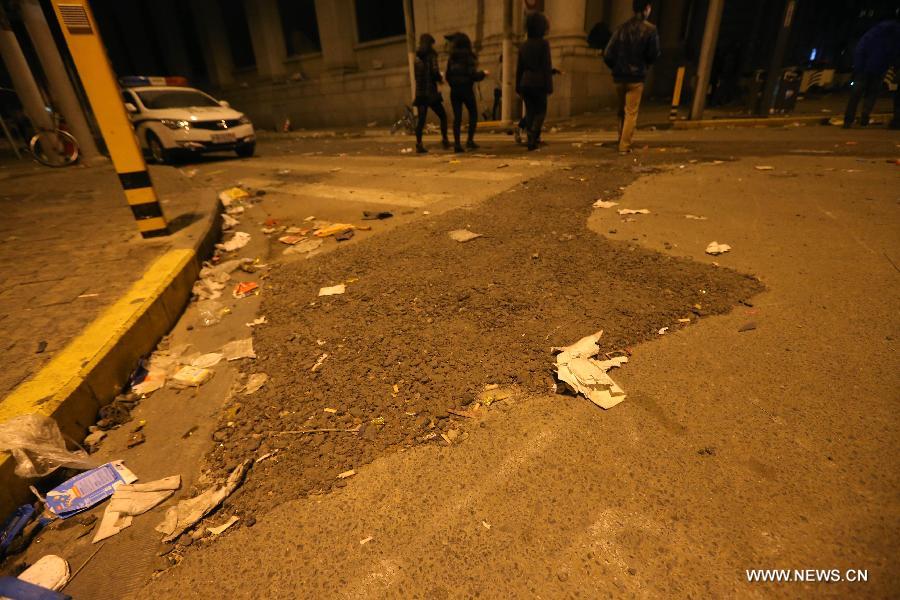 This photo taken on the early hours of Jan. 1, 2015 shows the scene of a stampede that caused casualties among people who took part in new year celebrations in east China's Shanghai. New Year celebrations in the bund area went astray early Thursday morning as a stampede resulted in casualties in east China's Shanghai. The injured people have been set to the No. 1 People's Hospital of Shanghai. (Xinhua/Ding Ting)