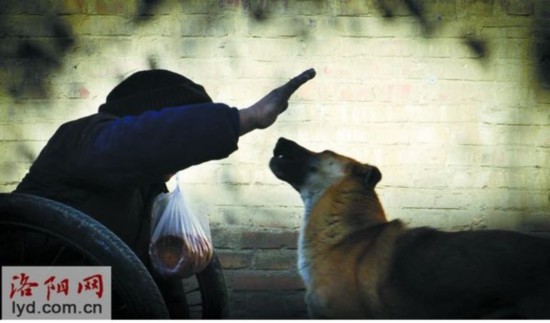 The dog pushes its handicapped owner on a wheelchair with its forelimbs in Luoyang, central China's Henan province, on Dec. 25, 2014. (Photo source: lyd.com.cn)