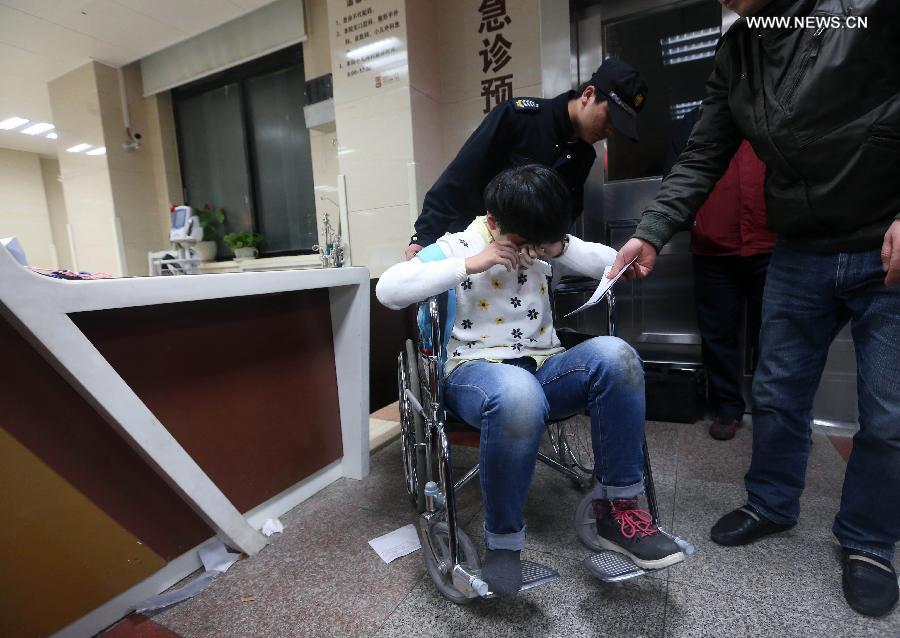 An injured person is seen at a hospital in Shanghai, east China, Jan. 1, 2015. New Year celebrations in Shanghai's bund area went astray Wednesday night as a stampede resulted in 36 people dead and 47 injured. The city has set up a working team for rescue operations and to deal with the aftermath. (Xinhua/Ding Ting)