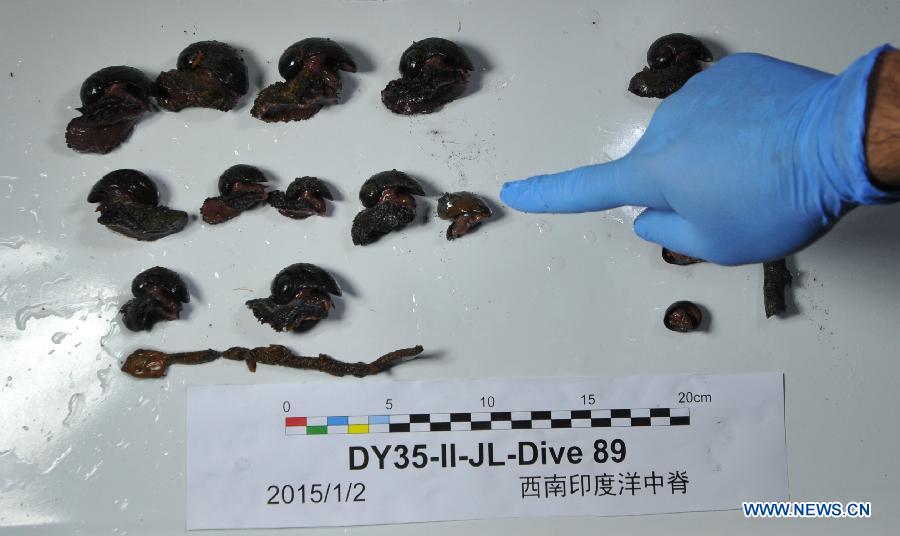 Photo taken on Jan. 2, 2015 shows biologic samples collected by China's deep sea manned submersible Jiaolong from seabed of southwestern Indian Ocean. Jiaolong carried out the first dive on a mission to study active hydrothermal vent in the southwestern Indian Ocean on Jan. 2. It was the first time for the submersible to take the second batch of pilot trainees in the diving, which was intended to enable the trainees to learn some skills of submersible operation in active hydrothermal vent and collect samples of hydrothermal fluid, sulfide, rocks, sediment and water. (Xinhua/Zhang Xudong)