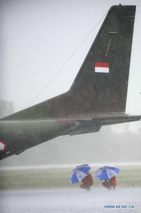 Indonesian air force pilots hold umbrellas to get shelter from heavy rain while their plane is canceled to fly at Pangkalan Bun, Indonesia, Jan. 4, 2015. The search and rescue team has yet to find the black boxes of crashed AirAsia flight QZ8501 as bad weather still lingers in the crash site, an Indonesian official said here Saturday. (Xinhua/Agung Kuncahya B.)