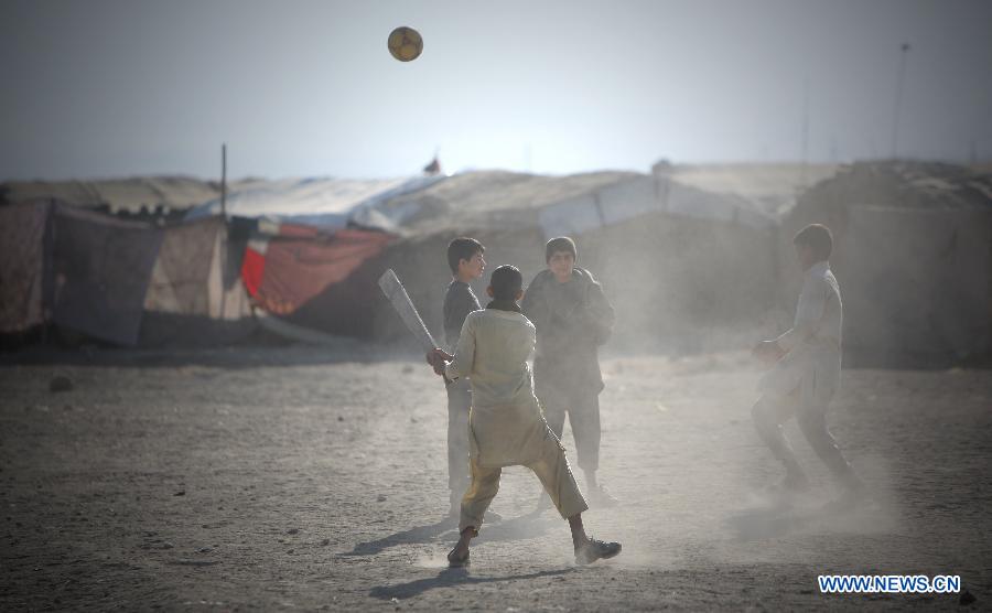 Afghan children play soccer on the dusty ground outside their homes at a slum area in Kabul, Afghanistan on Jan. 3, 2015. (Xinhua/Ahmad Massoud)