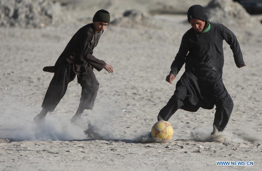| Afghan children play soccer on the dusty ground outside their homes at a slum area in Kabul, Afghanistan on Jan. 3, 2015. (Xinhua/Ahmad Massoud) |