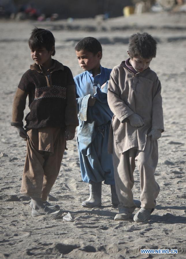 Afghan children stand on the dusty ground outside their homes at a slum area in Kabul, Afghanistan on Jan. 3, 2015. (Xinhua/Ahmad Massoud)