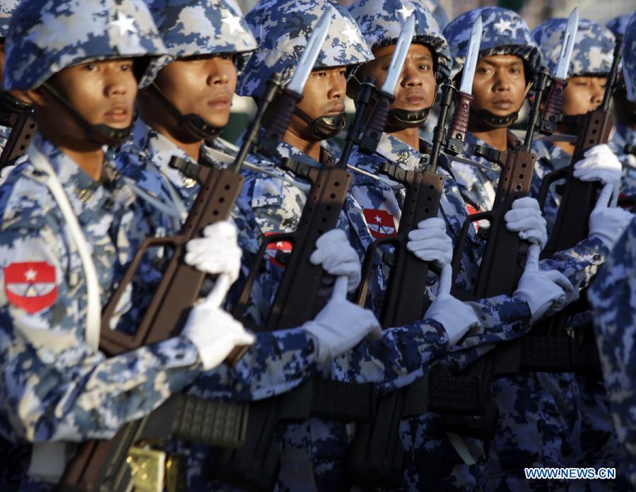 Myanmar soldiers participate in a ceremony to mark the 67th anniversary of Myanmar's Independence day in Nay Pyi Taw, Myanmar, Jan. 4, 2015. Myanmar resumed military parade and mass procession Sunday to celebrate the country's Independence Day for the first time in over five decades since the end of 1950s. (Xinhua/U Aung)