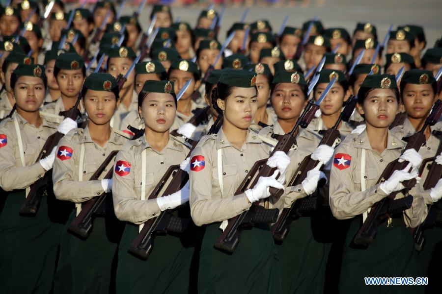 | Myanmar female soldiers participate in a ceremony to mark the 67th anniversary of Myanmar's Independence day in Nay Pyi Taw, Myanmar, Jan. 4, 2015. Myanmar resumed military parade and mass procession Sunday to celebrate the country's Independence Day for the first time in over five decades since the end of 1950s. (Xinhua/U Aung) |