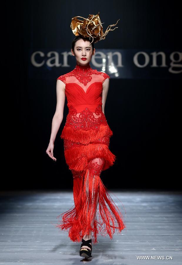 A model presents a creation by Malaysian designer Carven Ong at a wedding dress show during the China-ASEAN fashion week in Nanning, capital of southwest China's Guangxi Zhuang Autonomous Region, Jan. 3, 2015. (Xinhua/Chen Jianli)