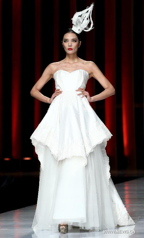 A model presents a creation by Malaysian designer Carven Ong at a wedding dress show during the China-ASEAN fashion week in Nanning, capital of southwest China's Guangxi Zhuang Autonomous Region, Jan. 3, 2015. (Xinhua/Chen Jianli)