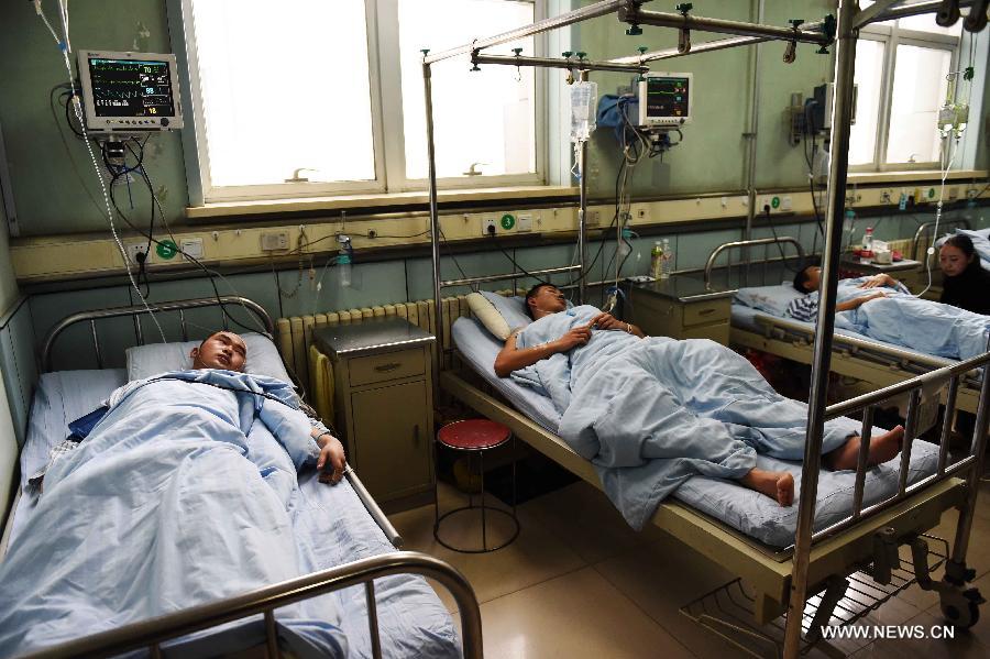 Firefighters injured in a warehouse blaze receive treatment at a hospital in Harbin, capital of northeast China's Heilongjiang Province, Jan. 3, 2015. A fire broke out at about 1 p.m. on Friday afternoon on the warehouse, which is part of an 11-story residential building. In total, five firefighters were killed and another 13 firefighters and a security guard were injured in the accident. (Xinhua/Wang Jianwei)