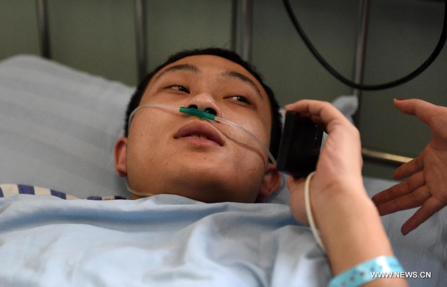 Firefighter Zhang Yu, who was injured in a warehouse blaze, answers phone calls of his friends at a hospital in Harbin, capital of northeast China's Heilongjiang Province, Jan. 3, 2015. A fire broke out at about 1 p.m. on Friday afternoon on the warehouse, which is part of an 11-story residential building. In total, five firefighters were killed and another 13 firefighters and a security guard were injured in the accident. (Xinhua/Wang Jianwei)