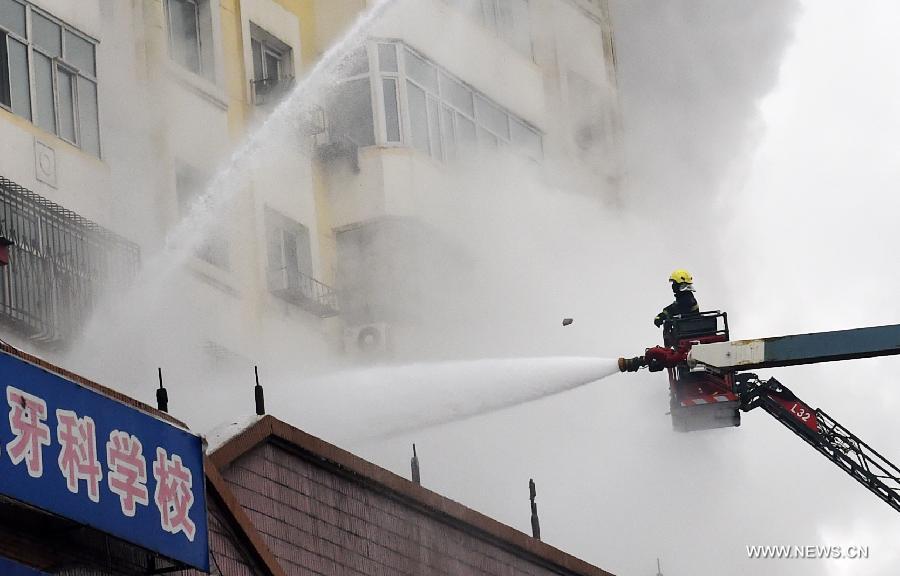 A firefighter sprays water to a burnt warehouse at the Beifangnanxun ceramics market in Daowai District, Harbin, capital of northeast China's Heilongjiang Province, Jan. 4, 2014. The warehouse blaze in Harbin City that killed 5 firefighters still hasn't been completely extinguished, local firefighters said on Sunday. As of 10:40 a.m. Sunday, a residential building next to the warehouse was still smoldering. Rescuers said that the source of the fire has been hard to determine due to the building's complicated structure, and the building is at risk of collapsing. Firefighters are working from outside to extinguish the flames. (Xinhua/Wang Jianwei)