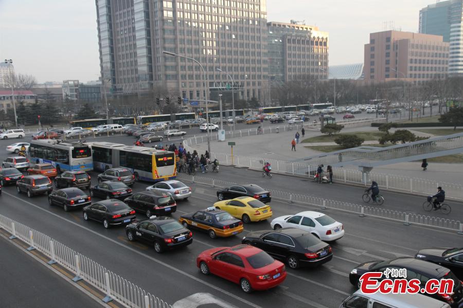 A general view of heavy traffic on a trunk road in Beijing during morning peak hours on the first workday, Jan 4, 2015. This workday after three-day New Year holiday happens to be Sunday when no private cars in Beijing are banned from the road under the current vehicle restriction rule. [Photo: China News Service/Liu Xianguo]