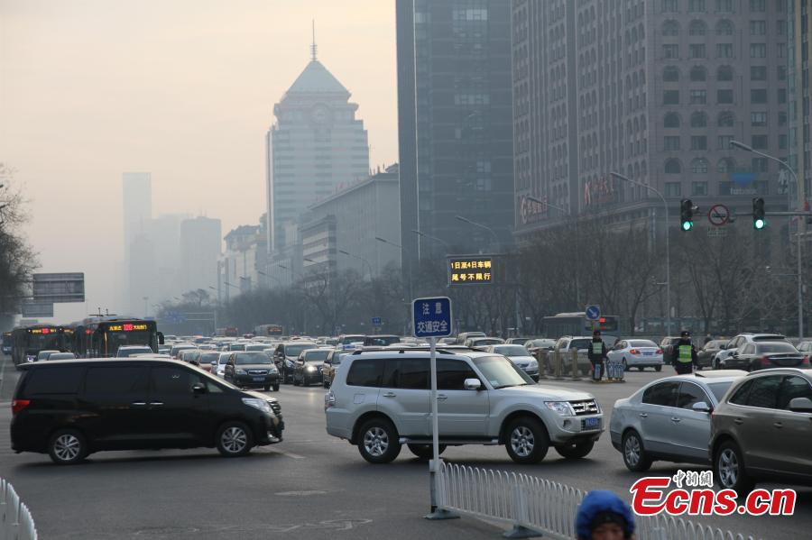 A general view of heavy traffic on a trunk road in Beijing during morning peak hours on the first workday, Jan 4, 2015. This workday after three-day New Year holiday happens to be Sunday when no private cars in Beijing are banned from the road under the current vehicle restriction rule. [Photo: China News Service/Liu Xianguo]
