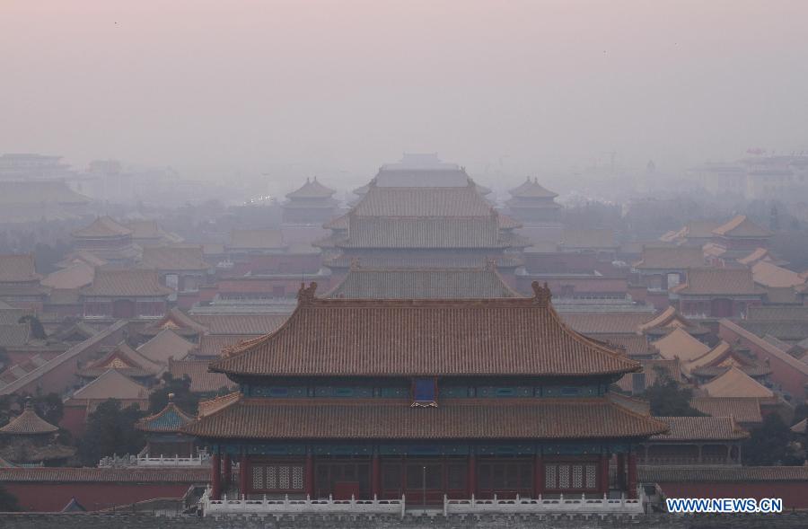 The Palace Museum, or the Forbidden City, is shrouded in smog in Beijing, capital of China, Jan. 4, 2015. China's top meteorological authority forecast medium to severe smog in the country's northern regions including Beijing and Tianjin as well as the neighboring Hebei Province on Sunday. Meanwhile, smoggy weather will also affect the country's eastern province of Jiangsu as well as the southwestern province of Sichuan on Sunday. (Xinhua/Liu Xianguo)