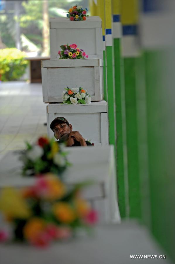 A man sits near coffins of victims of AirAsia Flight QZ8501 at a hospital in Pangkalan Bun, Indonesia. Jan. 4, 2015. An Indonesian pilot taking part in the multinational search operation said here on Sunday that three more bodies were found in AirAsia crash site off Borneo coast. (Xinhua/Agung Kuncahya B.)