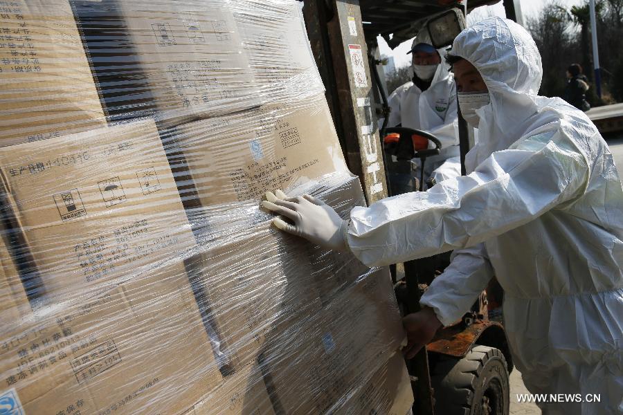 Workers of an innocuous treatment center take Husi's unqualified food to dispose in Shanghai, east China, Jan. 4, 2015. A total of 521.21 tons of unqualified food Husi recalled were safely disposed after the last 1415 boxes were disposed on Sunday. Shanghai Husi Food Co., Ltd, a meat supplier for mainly McDonald and KFC, was investigated in July of 2014 for supplying stale meat to McDonald and KFC outlets. (Xinhua/Pei Xin)