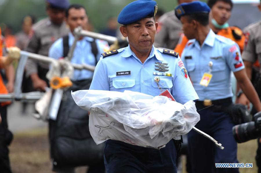 TNII crew members carry debris of AirAsia flight QZ8501 from USS Navy helicopter at Iskandar Air Base, Pangkalan Bun, Central Kalimantan, Indonesia, Jan. 5, 2015. (Xinhua/Veri Sanovri)