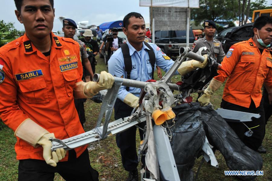 TNI and Search and Rescue (SAR) crew members carry debris of AirAsia flight QZ8501 from USS Navy helicopter at Iskandar Air Base, Pangkalan Bun, Central Kalimantan, Indonesia, Jan. 5, 2015. (Xinhua/Veri Sanovri)