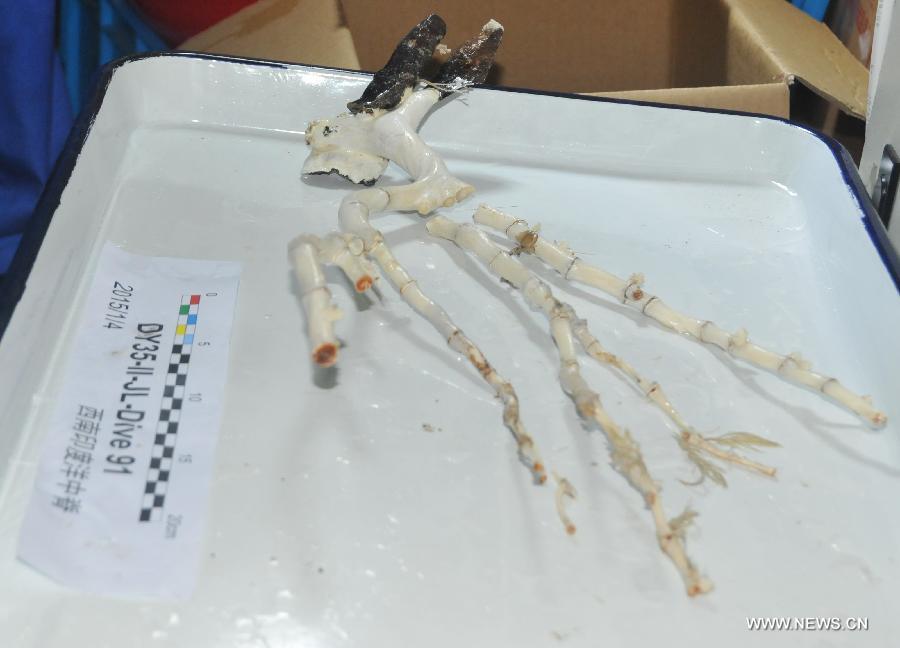 Photo taken on Jan. 4, 2015 shows a piece of coral collected by China's deep sea manned submersible Jiaolong from seabed of a hydrothermal vent in the southwestern Indian Ocean. Jiaolong on Saturday collected a perfect "chimney vent" with several mussels and spiral shells living on it. (Xinhua/Zhang Xudong)