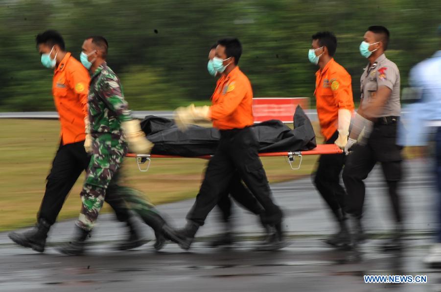 | Members of SAR, police and TNI crews walk to carry the body bag that contains victim of AirAsia flight QZ8501 at Iskandar Air Force Base, Pangkalan Bun, Central Kalimantan, Indonesia, Jan. 5, 2015. (Xinhua/Veri Sanovri) |