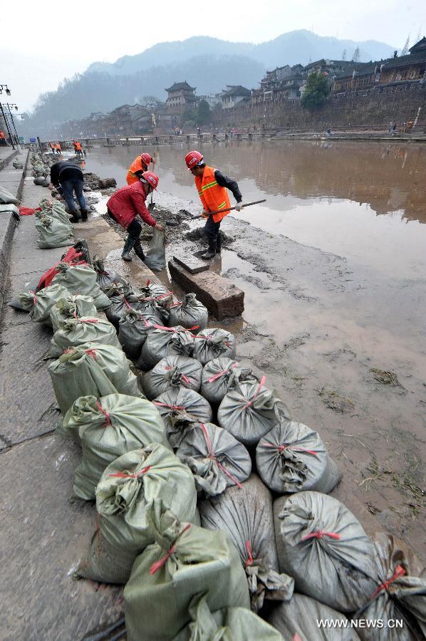 Workers dredge the Tuojiang River in the ancient town of Fenghuang, central China's Hunan Province, Jan. 7, 2015. A dredging operation for the 3,900-meter-long Tuojiang River began on Tuesday and was estimated to be finished on Feb. 15. (Xinhua/Long Hongtao)