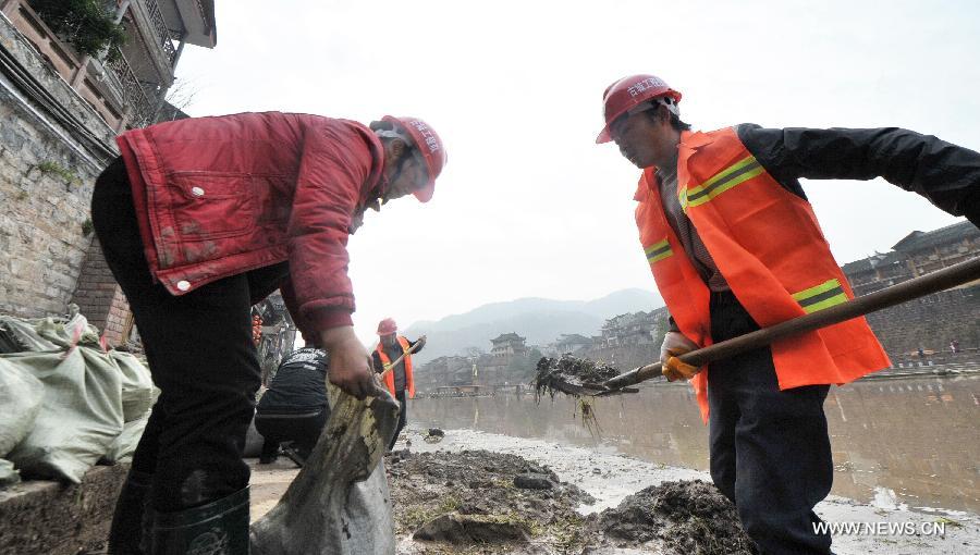Workers the Tuojiang River in the ancient town of Fenghuang, central China's Hunan Province, Jan. 7, 2015. A dredging operation for the 3,900-meter-long Tuojiang River began on Tuesday and was estimated to be finished on Feb. 15. (Xinhua/Long Hongtao)