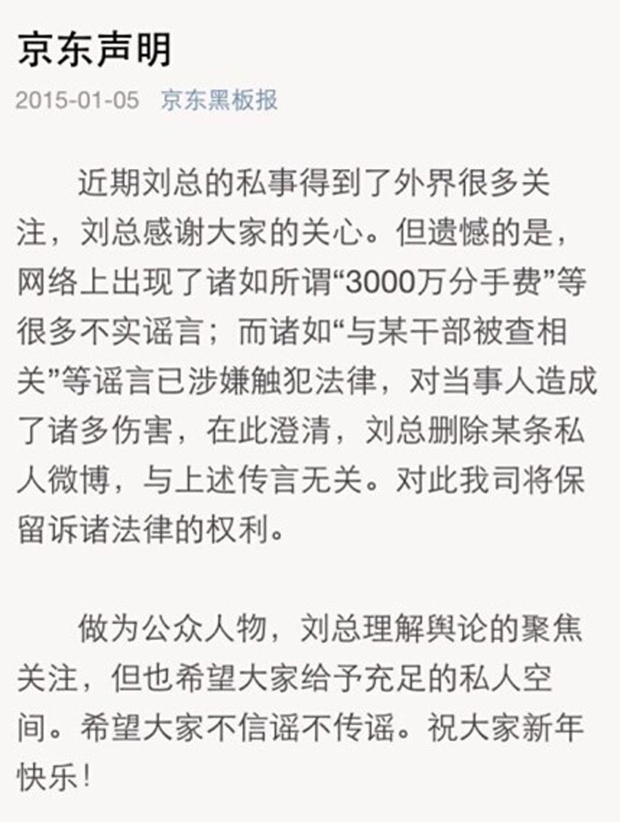 | Jingdong releases a statement online over the break-up fee, Monday, January 5, 2015. [Photo: Jingdong] |