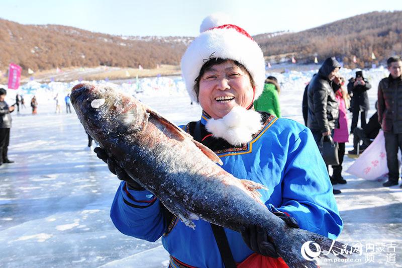 An Elunchun woman shows a big fish caught at the winter fishing festival in Zhalantun city, north China's Inner Mongolia, Jan. 2, 2015. (nm.people.cn/Han Leng)