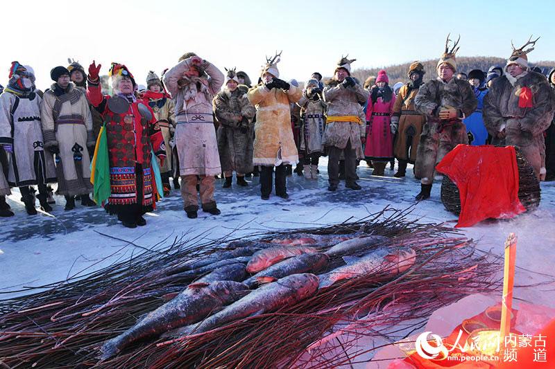 A winter fishing festival of Elunchun ethnic group kicked off in Zhalantun city, north China's Inner Mongolia on January 2, 2015. A river god sacrifice ceremony was held before the fishing festival began. More than 30,000 kilograms of fish was caught that day.